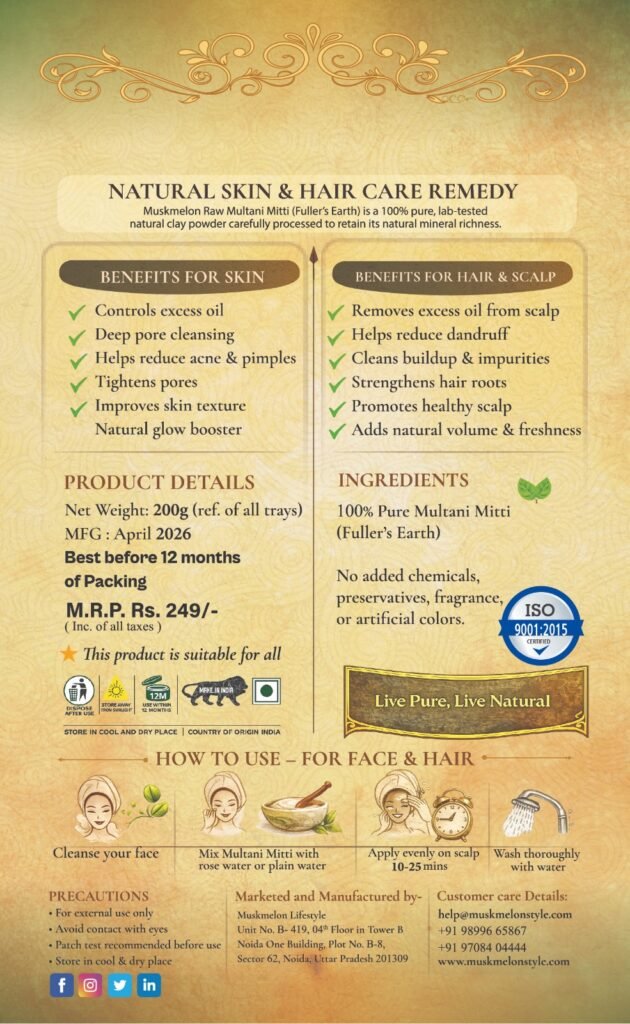 Muskmelon Lifestyle is a premium, nature-driven skincare brand specializing in Multani Mitti based formulations. Rooted in purity and earth-first values, we create eco-friendly, hygienic, and responsibly sourced skincare that blends traditional Indian skincare wisdom with modern science. Our clean, effective products promote healthy, balanced skin while delivering conscious luxury where authenticity, sustainability, and refined simplicity come together naturally.